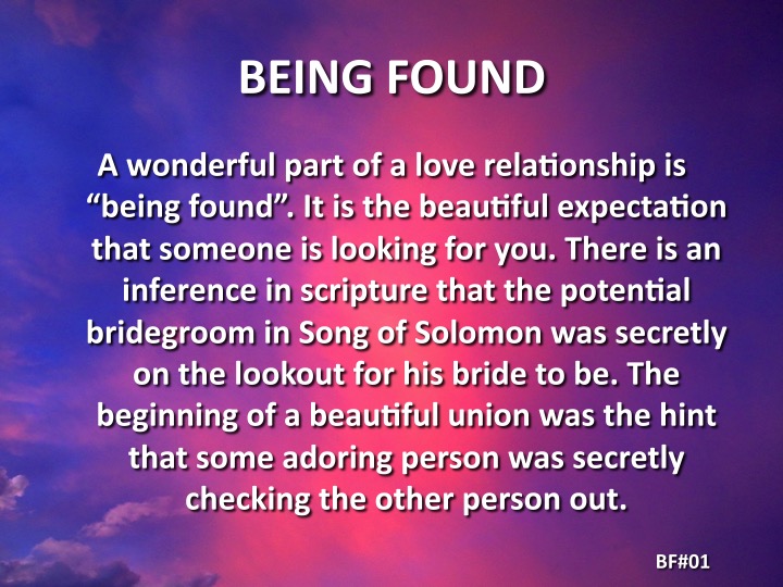 A wonderful part of a love relationship is “being found.” It is the beautiful expectation that someone is looking for you. There is an inference in scripture that the potential bridegroom in Song of Solomon was secretly on the look out for his bride to be. The beginning of a […]
