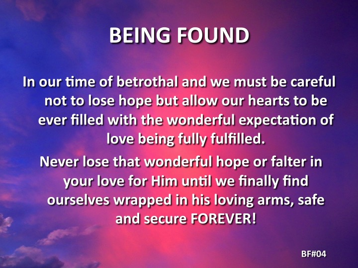 In our time of betrothal we must be careful not to lose hope but allow our hearts to be ever filled with the wonderful expectation of love being fully fulfilled. Never lose that wonderful hope or falter in your love for Him until we finally find ourselves wrapped in His […]