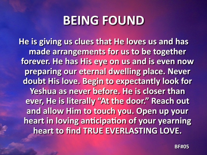 He is giving us clues that He loves us and has made arrangements for us to be together forever. He has His eye on us and is even now preparing our eternal dwelling place. Never doubt His love. Begin to expectantly look for Yeshua (Jesus) as never before. He is […]