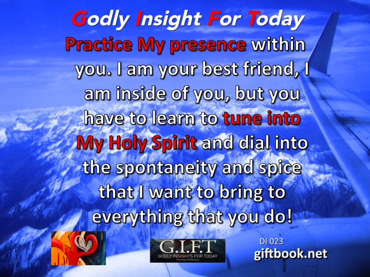 Practice My presence within you. I am your best friend, I am inside of you, but you have to learn to tune into My Holy Spirit and dial into the spontaneity and spice that I want to bring to everything that you do!