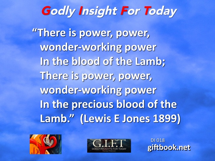 ‘There is power, power wonder-working power In the blood of the Lamb; There is power, power wonder-working power In the precious blood of the Lamb’ Lewis E Jones 1899