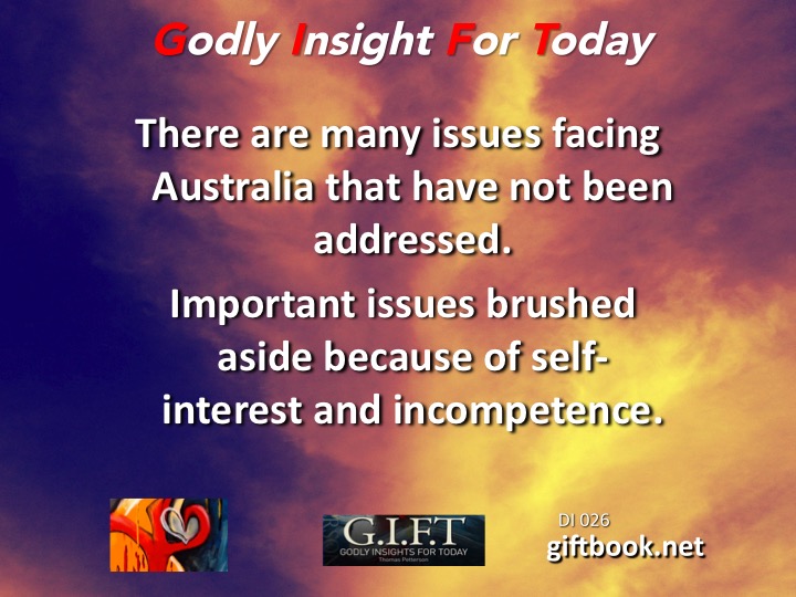 There are many issues facing Australia that have not been addressed. Important issues brushed aside because of self interest and incompetence.