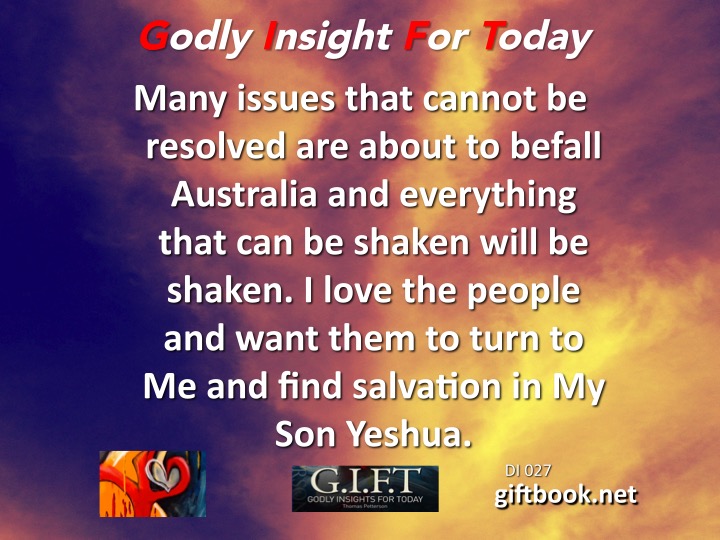 Many issues that cannot be resolved are about to befall Australia and everything that can be shaken will be shaken. I love the people and want them to turn to Me and find salvation in My Son Yeshua (Jesus)!
