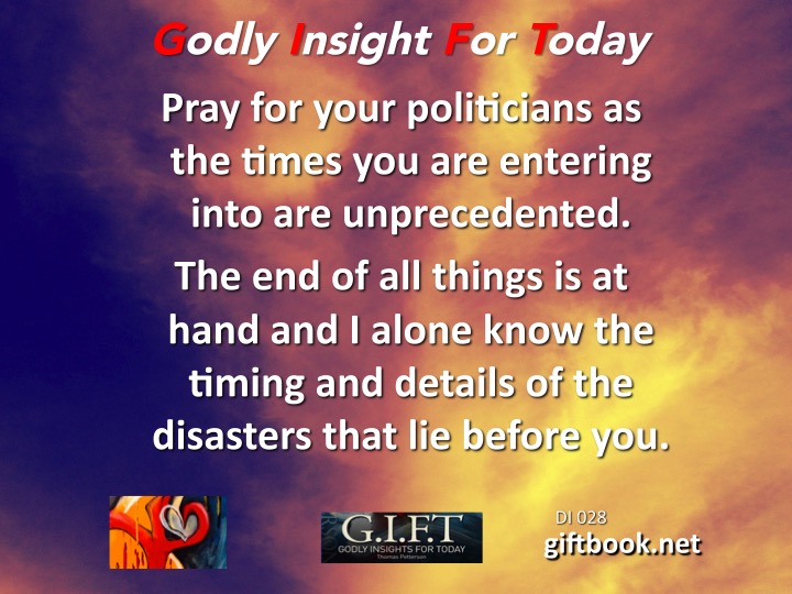 Pray for your politicians as the times you are entering into are unprecedented. The end of all things is at hand and I alone know the timing and details of the disasters that lie before you.