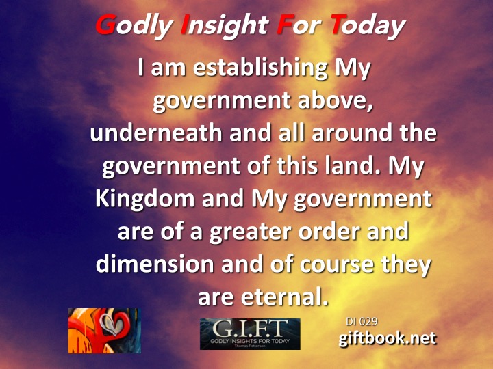 I am establishing My government above, underneath and all around the government of this land. My Kingdom and My government are of greater order and dimension and of course they are eternal.