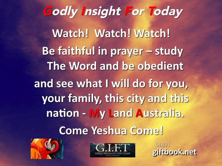 Watch! Watch! Watch! Be faithful in prayer – study the Word and be obedient and see what I will do for you, your family, this city and this nation – My Land Australia. Come Yeshua (Jesus) Come!