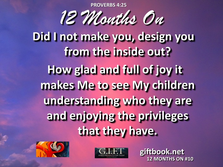 Did I not make you, design you from the inside out? How glad and full of joy it makes Me to see My children understanding who they are and enjoying the privileges that they have! Click on BUY NOW to purchase you own G.I.F.T. Godly Insights For Today EBook