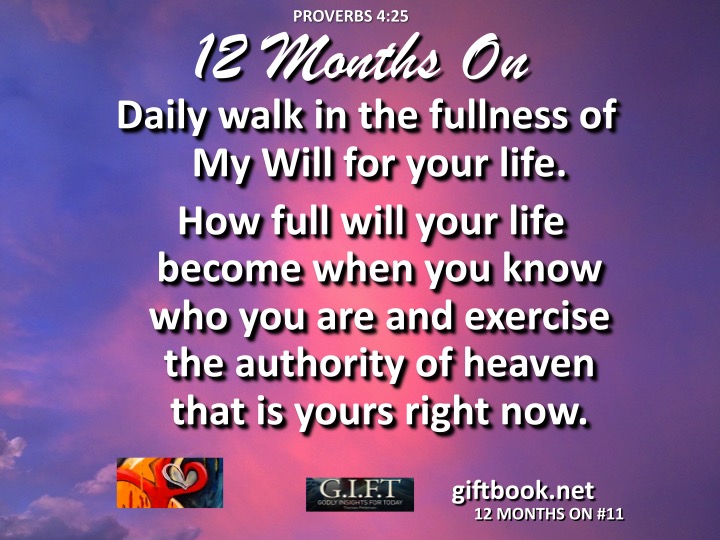 Click on BUY NOW to purchase you own G.I.F.T. Godly Insights For Today EBook Daily walk in the fullness of My Will for your life. How full will your life become when you know who you are and exercise the authority of heaven that is yours right now!