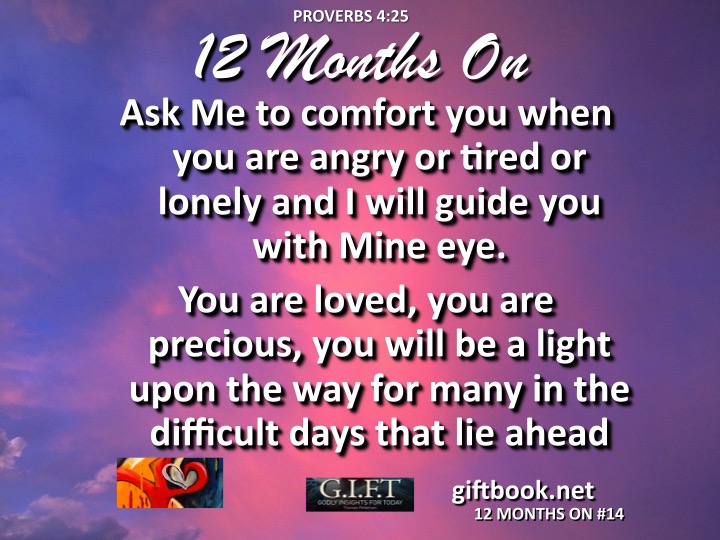 Ask Me to comfort you when you are angry or tired or lonely and I will guide you with Mine eye. You are loved, you are precious, you will be a light upon the way for many in the difficult days that lie ahead.