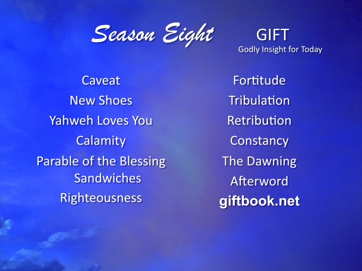 G.I.F.T. Godly Insights For Today has been updated. Season 8 has been added and now published. Caveat New Shoes Yahweh Loves You Calamity Parable of the Blessing Sandwiches Righteousness Fortitude Tribulation Retribution Constancy The Dawning Afterword